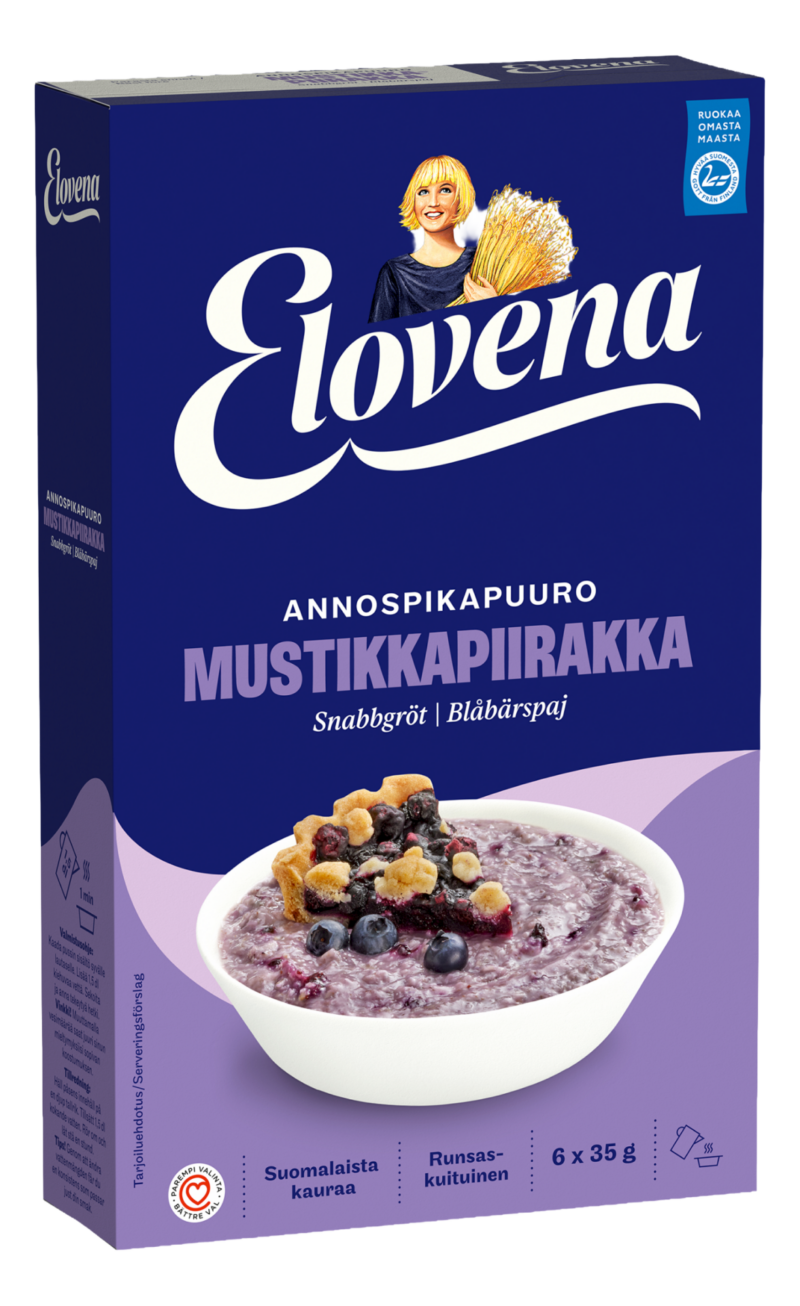 Maistuvaa mustikkapiirakanmakuista kaurapuuroa kätevästi kädenkäänteessä. Elovena Annospikapuurossa on runsaasti täysjyväkauraa ja kuitua ja se vie ajatukset kesän pehmeisiin mustikkapiirakan makuihin. Tyhjennä puuropussi lautaselle, lisää kuuma vesi, odota minuutti ja herkkupuuro on valmis. Arkinen herkkuhetki helli makuhermoja ja vatsaa. Ihan sitä tuttua kauraa!