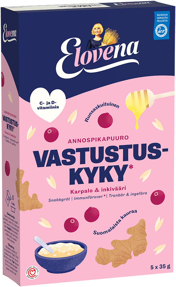 Elovena annospikapuuro Vastustuskyky auttaa ylläpitämään vastustuskykyä. Herkullisen marjaisa puuro saa makunsa karpaloista ja sitä täydentää inkiväärin tuoma lämpö. Puuroon on lisätty C- ja D-vitamiinia, jotka edistävät immuunijärjestelmän normaalia toimintaa osana monipuolista ruokavaliota ja terveitä elintapoja. Tuote on valmistettu Suomessa suomalaisesta kaurasta. Tuotteelle myönnetty Sydänmerkki kertoo, että se on terveellisempi valinta omassa tuoteryhmässään.