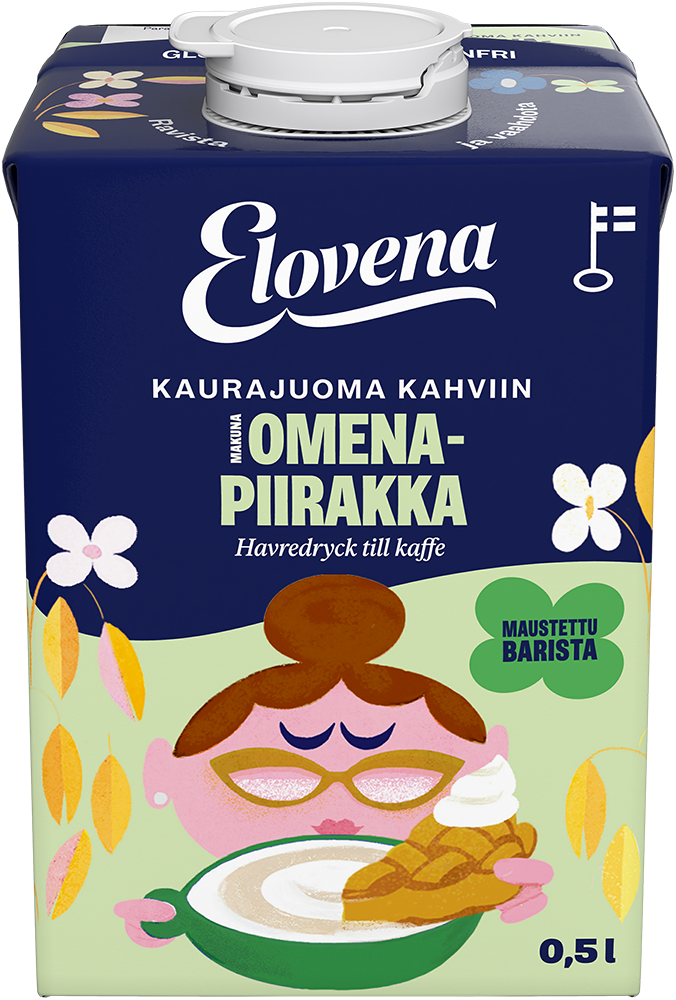Elovena kaurajuoma kahviin omenapiirakka on herkullinen uusi tapa maustaa kahvi. Tämän tuotteen voit vaahdottaa ja tehdä sillä herkullisia erikoiskahveja. Kokeile juoda myös sellaisenaan tai lisää mausteeksi muroihin tai aamupuuroon. Toimii myös leivonnassa. Elovena -täyttä eloa.