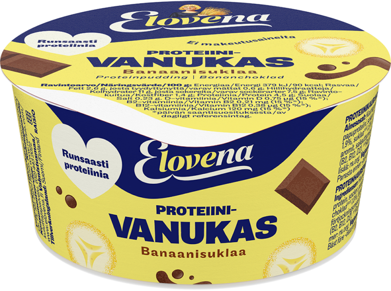 Elovena Proteiinivanukas on silkkisen pehmeä ja täyteläisen suklainen kaurapohjainen vanukas, joka sisältää runsaasti proteiinia. Elovena proteiinivanukas toimii loistavasti välipalana tai hetkinä jolloin haluat herkutella terveellisesti. Tuote maistuu herkulliselta, mutta ei sisällä keinotekoisia makeutusaineita. Proteiinivanukas on valmistettu hiilineutraalilla energialla Raisiossa suomalaisesta kaurasta ja sille on myönnetty Sydänmerkki. Pakkaus on kokonaan kierrätettävä: kansi lajitellaan metallinkeräykseen, purkin sisäosa muovinkeräykseen ja irrotettava pahvivyöte kartonkikeräykseen.
