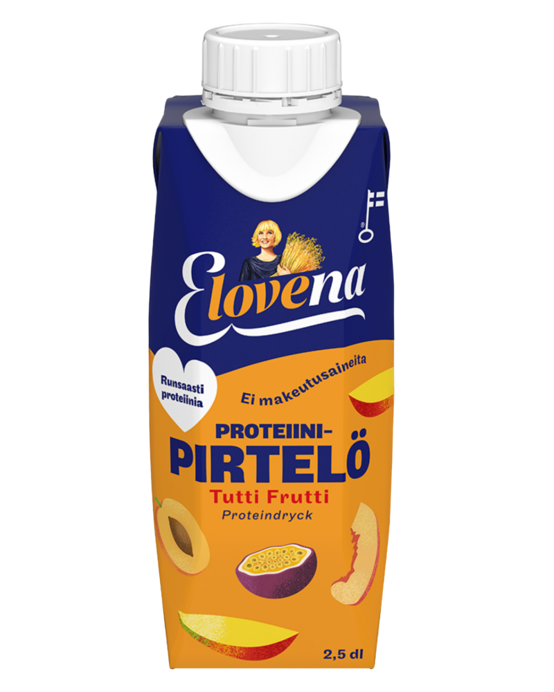 Elovena Proteiinipirtelö on nopea ja herkullinen välipala keskellä arjen kiireitä. Se toimii loistavana välipalana myös ennen tai jälkeen treenien. Elovena Proteiinipirtelö on täysin kasvipohjainen ja valmistettu Suomessa hiilineutraalilla energialla, 100% gluteenittomasta kaurasta.