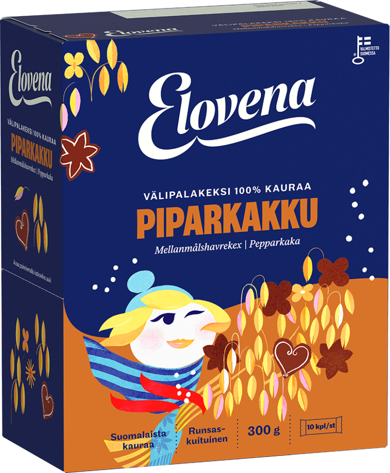 Elovena Piparkakku Välipalakeksi maistuu joulun mausteilta ja on herkullinen välipala joulun odotukseen. Täysjyväkeksin vilja on 100% kauraa ja leivonnassa on käytetty rapsiöljyä. Runsaskuituinen, kätevä, yksittäispakattu keksi on helppo ottaa mukaan ja nauttia aina, kun tarvitsee energiaa maistuvassa muodossa. Tuote on valmistettu Suomessa suomalaisesta kaurasta.